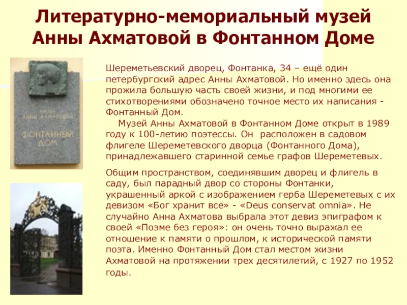 Общим пространством, соединявшим дворец и флигель в саду, был парадный двор со стороны Фонтанки, украшенный аркой с изображением герба Шереметевых с их девизом «Бог хранит все» - «Deus conservat omnia». Не случайно Анна Ахматова выбрала этот девиз эпиграфом к своей «Поэме без героя»: он очень точно выражал ее отношение к памяти о прошлом, к исторической памяти поэта. Именно Фонтанный Дом стал местом жизни Ахматовой на протяжении трех десятилетий, с 1927 по 1952 годы.