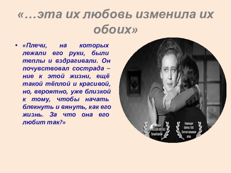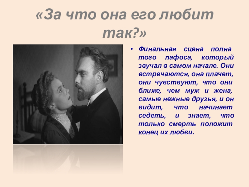 звучал в самом начале. Они встречаются, она плачет, они чувствуют, что они ближе, чем муж и жена, самые нежные друзья, и он видит, что начинает седеть, и знает, что только смерть положит конец их любви.