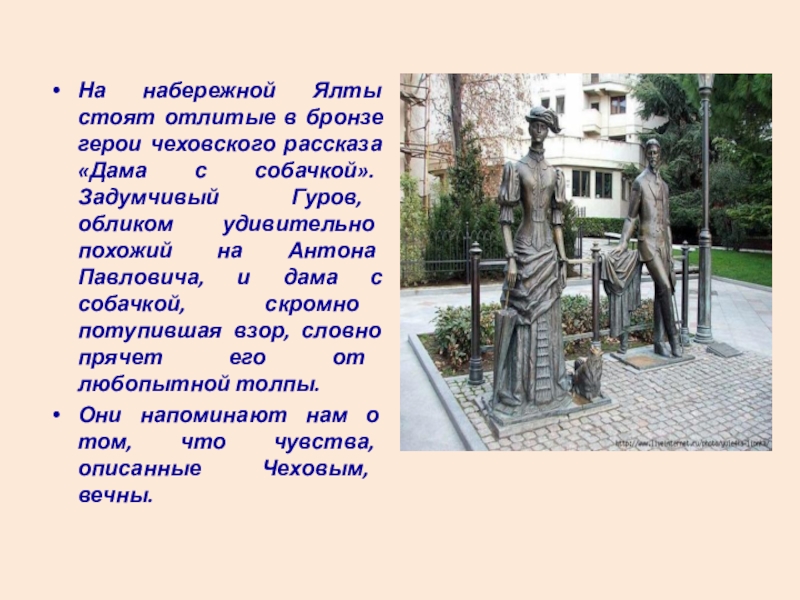 Слайд 27На набережной Ялты стоят отлитые в бронзе герои чеховского рассказа «Дама