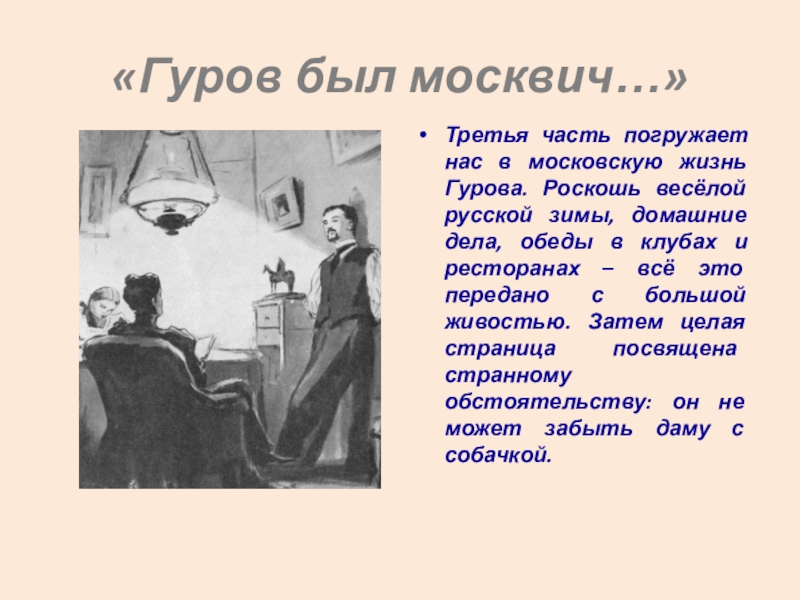 весёлой русской зимы, домашние дела, обеды в клубах и ресторанах – всё это передано с большой живостью. Затем целая страница посвящена странному обстоятельству: он не может забыть даму с собачкой.