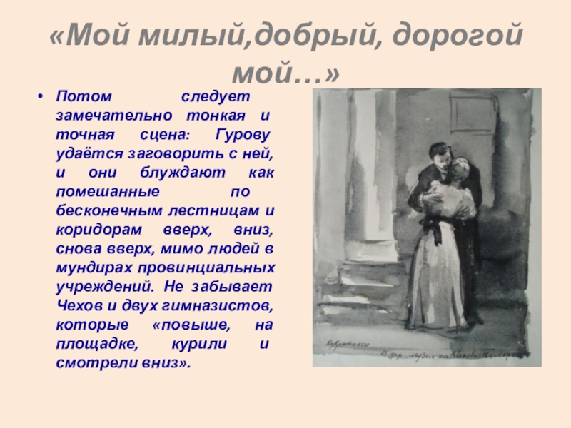 удаётся заговорить с ней, и они блуждают как помешанные по бесконечным лестницам и коридорам вверх, вниз, снова вверх, мимо людей в мундирах провинциальных учреждений. Не забывает Чехов и двух гимназистов, которые «повыше, на площадке, курили и смотрели вниз».