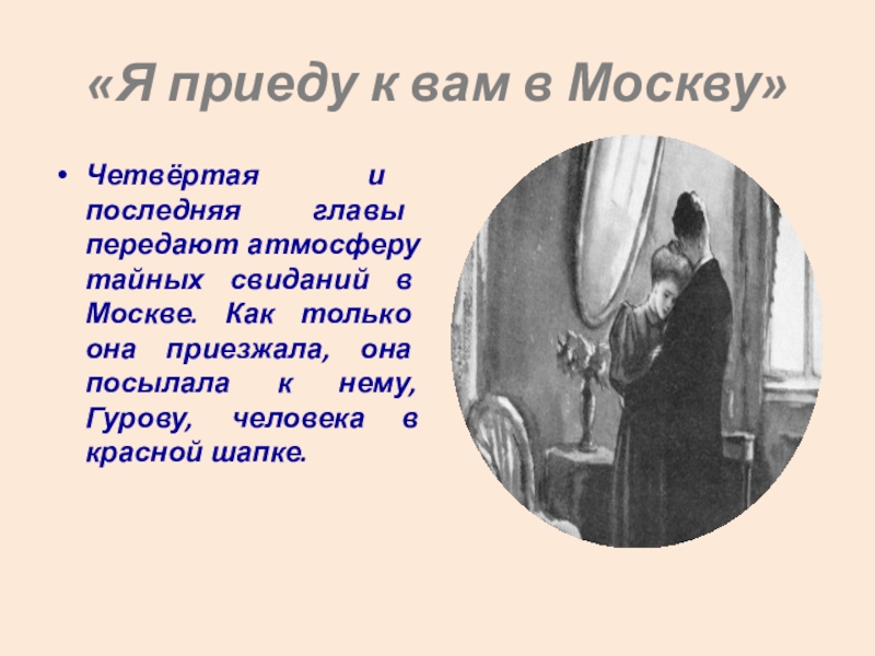 тайных свиданий в Москве. Как только она приезжала, она посылала к нему, Гурову, человека в красной шапке.