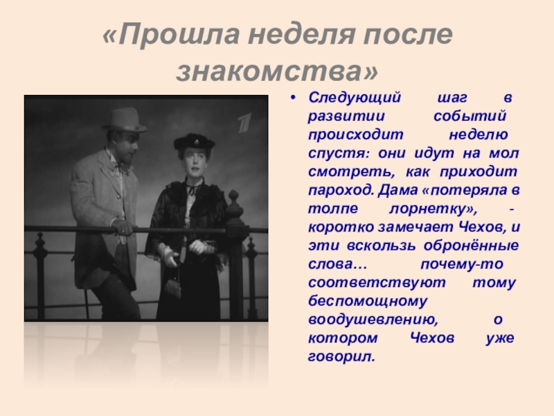 они идут на мол смотреть, как приходит пароход. Дама «потеряла в толпе лорнетку», - коротко замечает Чехов, и эти вскользь обронённые слова… почему-то соответствуют тому беспомощному воодушевлению, о котором Чехов уже говорил.