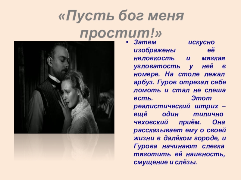 у неё в номере. На столе лежал арбуз. Гуров отрезал себе ломоть и стал не спеша есть. Этот реалистический штрих – ещё один типично чеховский приём. Она рассказывает ему о своей жизни в далёком городе, и Гурова начинают слегка тяготить её наивность, смущение и слёзы.