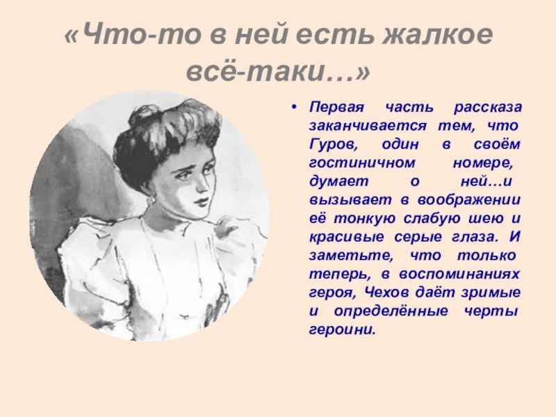 Гуров, один в своём гостиничном номере, думает о ней…и вызывает в воображении её тонкую слабую шею и красивые серые глаза. И заметьте, что только теперь, в воспоминаниях героя, Чехов даёт зримые и определённые черты героини.