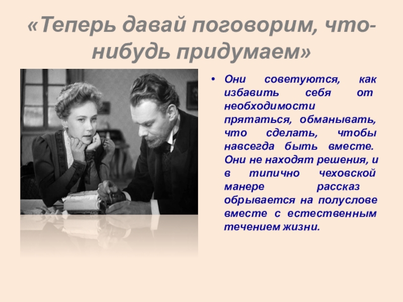 прятаться, обманывать, что сделать, чтобы навсегда быть вместе. Они не находят решения, и в типично чеховской манере рассказ обрывается на полуслове вместе с естественным течением жизни.