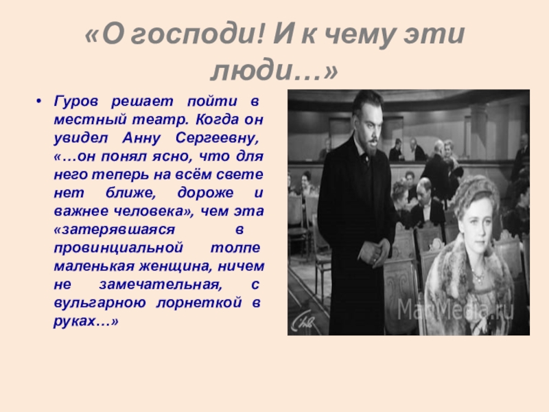 театр. Когда он увидел Анну Сергеевну, «…он понял ясно, что для него теперь на всём свете нет ближе, дороже и важнее человека», чем эта «затерявшаяся в провинциальной толпе маленькая женщина, ничем не замечательная, с вульгарною лорнеткой в руках…»