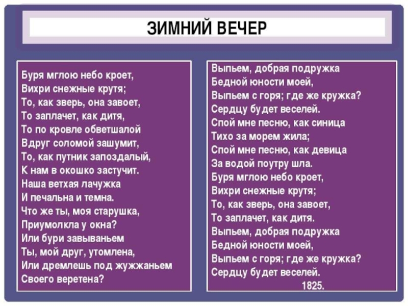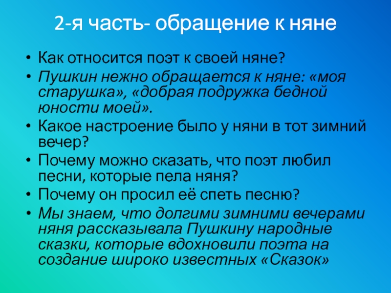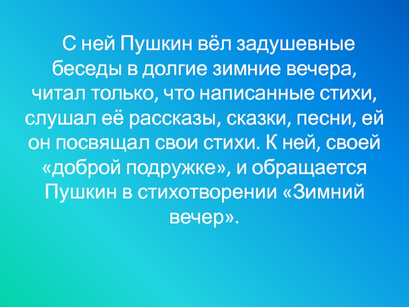 читал только, что написанные стихи, слушал её рассказы, сказки, песни, ей он посвящал свои стихи. К ней, своей «доброй подружке», и обращается Пушкин в стихотворении «Зимний вечер».
