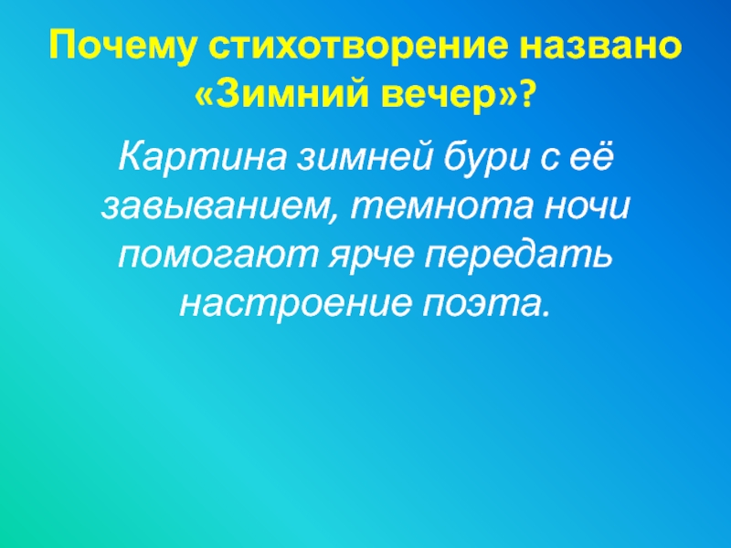 Слайд 19Почему стихотворение названо «Зимний вечер»?