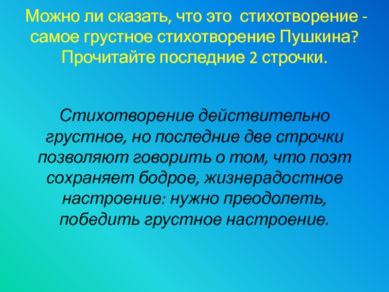 Слайд 17Можно ли сказать, что это стихотворение - самое грустное стихотворение Пушкина?