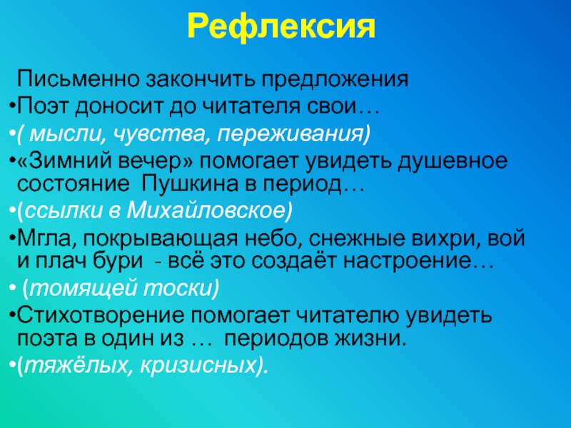 «Зимний вечер» помогает увидеть душевное состояние Пушкина в период…