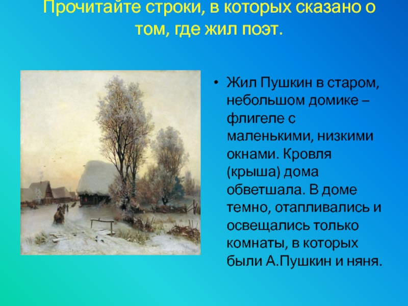 в старом, небольшом домике – флигеле с маленькими, низкими окнами. Кровля (крыша) дома обветшала. В доме темно, отапливались и освещались только комнаты, в которых были А.Пушкин и няня.