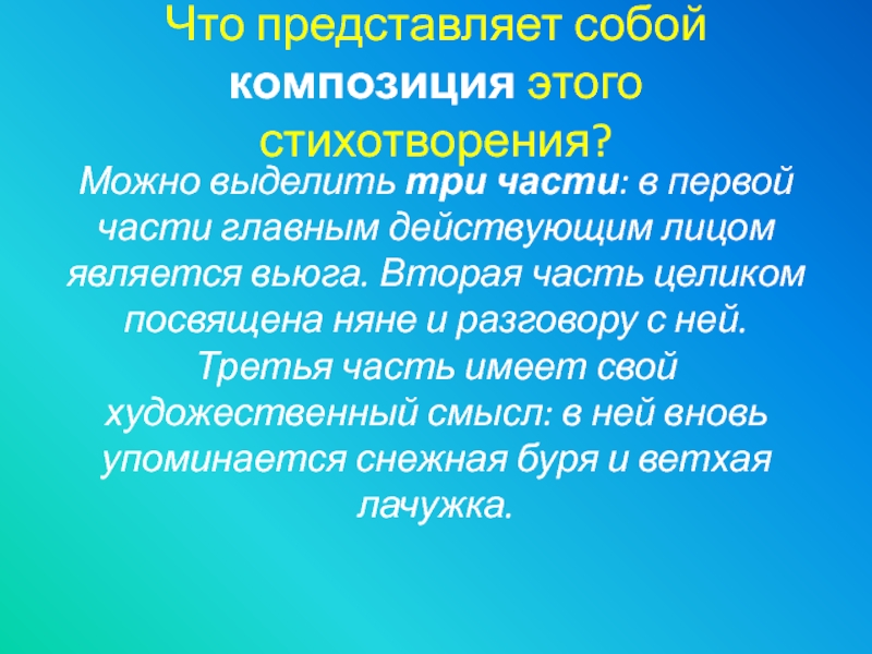 первой части главным действующим лицом является вьюга. Вторая часть целиком посвящена няне и разговору с ней. Третья часть имеет свой художественный смысл: в ней вновь упоминается снежная буря и ветхая лачужка.