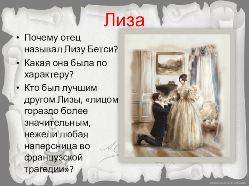 ЛизаПочему отец называл Лизу Бетси?Какая она была по характеру?Кто был лучшим другом Лизы, «лицом гораздо более значительным,