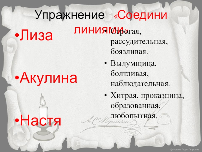 Упражнение  «Соедини  линиями»ЛизаАкулинаНастяСтрогая, рассудительная, боязливая.Выдумщица, болтливая, наблюдательная.Хитрая, проказница, образованная, любопытная.