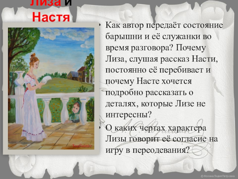 Лиза и НастяКак автор передаёт состояние барышни и её служанки во время разговора? Почему Лиза, слушая рассказ
