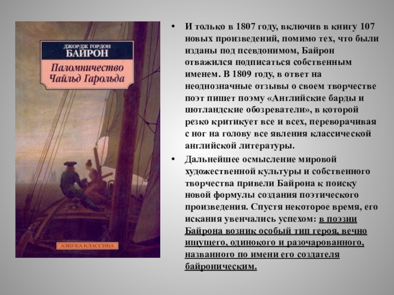Дальнейшее осмысление мировой художественной культуры и собственного творчества привели Байрона к поиску новой формулы создания поэтического произведения. Спустя некоторое время, его искания увенчались успехом: в поэзии Байрона возник особый тип героя, вечно ищущего, одинокого и разочарованного, названного по имени его создателя байроническим.