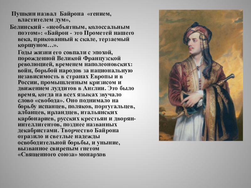 Слайд 6 Пушкин назвал Байрона «гением, властителем дум»,