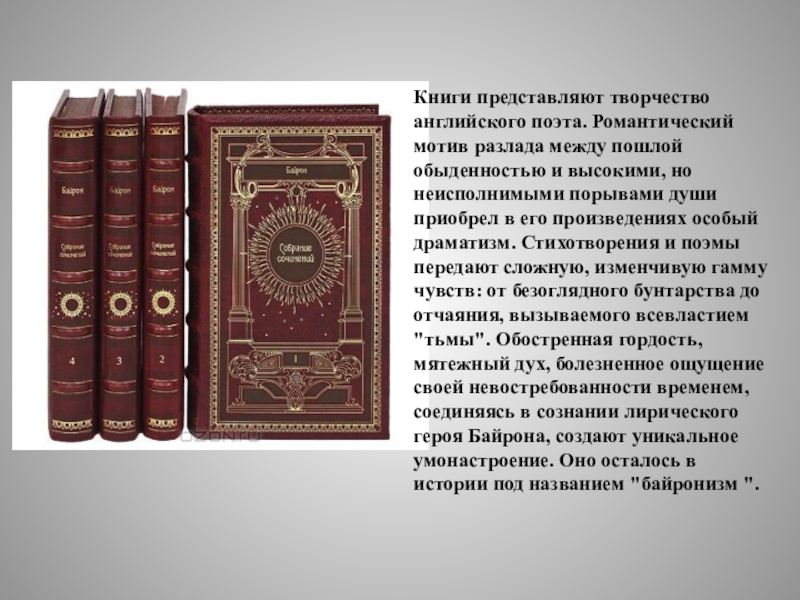Слайд 7Книги представляют творчество английского поэта. Романтический мотив разлада между пошлой обыденностью