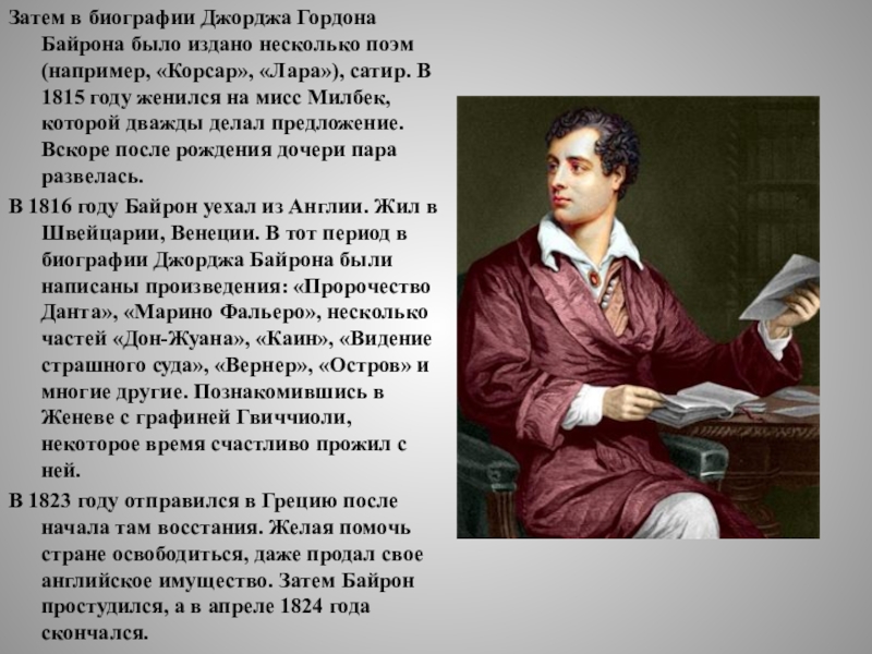 Слайд 3Затем в биографии Джорджа Гордона Байрона было издано несколько поэм (например,