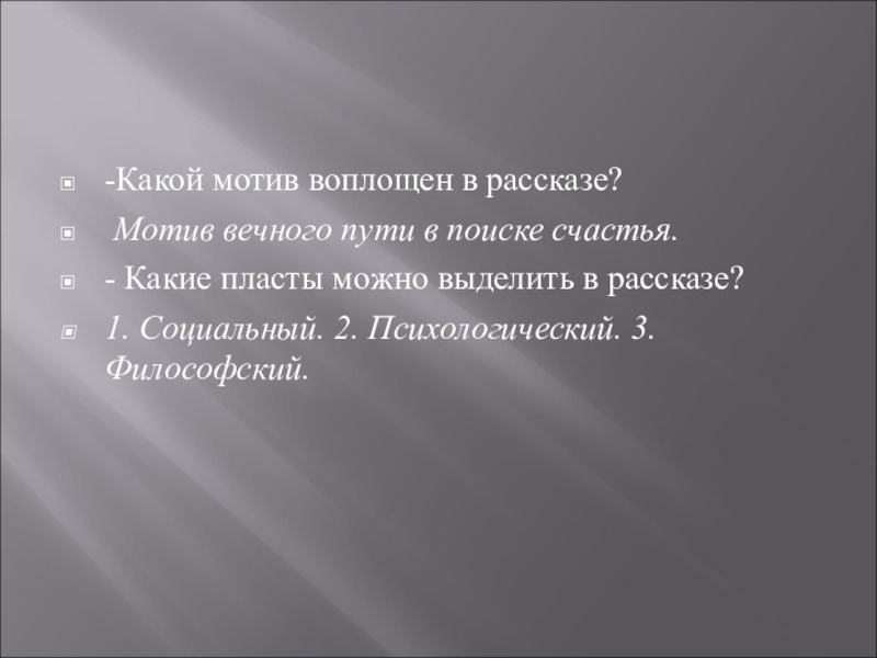 -Какой мотив воплощен в рассказе? Мотив вечного пути в поиске счастья.- Какие пласты можно выделить в рассказе?1.