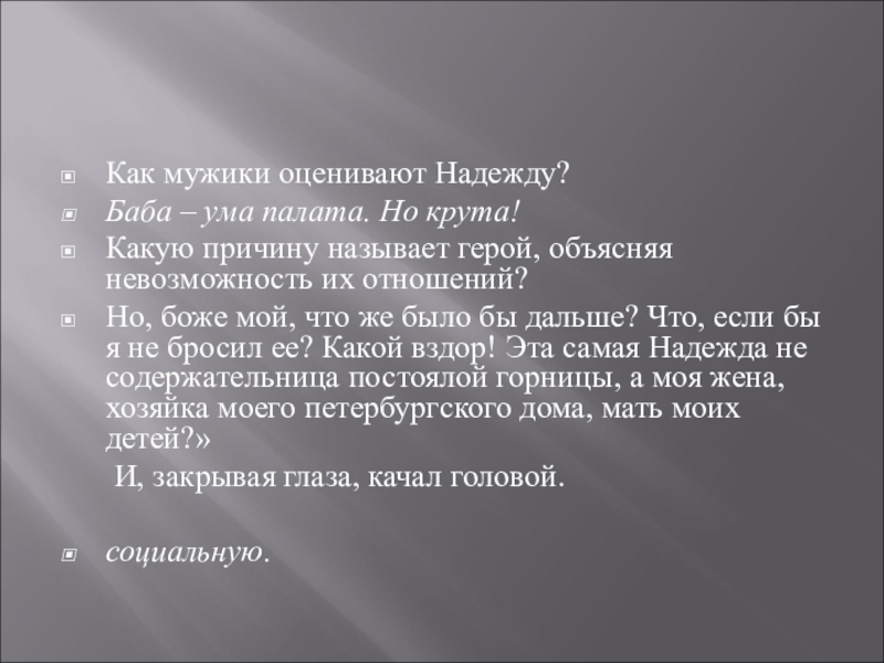 Как мужики оценивают Надежду? Баба – ума палата. Но крута!Какую причину называет герой, объясняя невозможность их отношений?