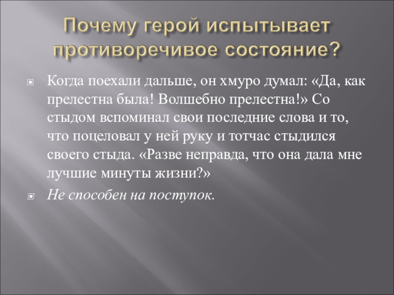 Слайд 14Когда поехали дальше, он хмуро думал: «Да, как прелестна была! Волшебно