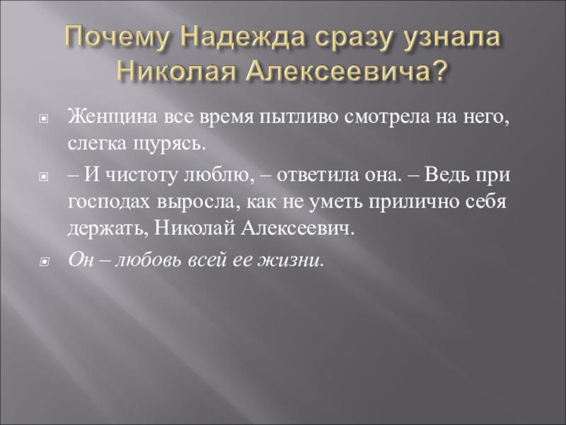 Слайд 7Женщина все время пытливо смотрела на него, слегка щурясь.