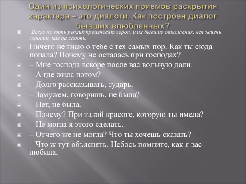 Слайд 9 Всего по пять реплик произносят герои, и их бывшие отношения,