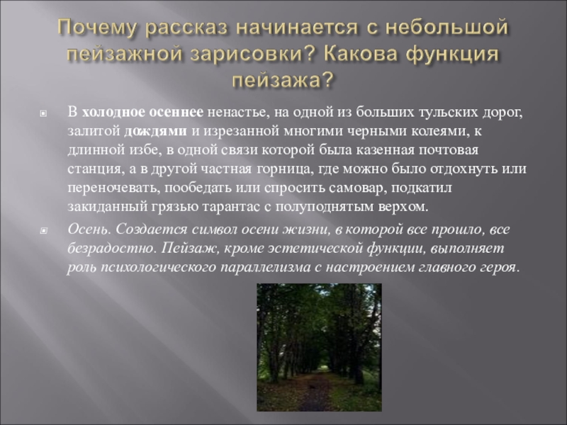 Осень. Создается символ осени жизни, в которой все прошло, все безрадостно. Пейзаж, кроме эстетической функции, выполняет роль психологического параллелизма с настроением главного героя.