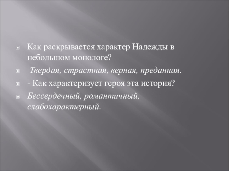 Как раскрывается характер Надежды в небольшом монологе? Твердая, страстная, верная, преданная.- Как характеризует героя эта история? Бессердечный,