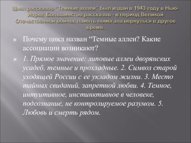 Почему цикл назван “Темные аллеи? Какие ассоциации возникают?1. Прямое значение: липовые аллеи дворянских усадеб, темные и прохладные. 2. Символ старой уходящей России с ее укладом жизни. 3. Место тайных свиданий, запретной любви. 4. Темное, интуитивное, инстинктивное