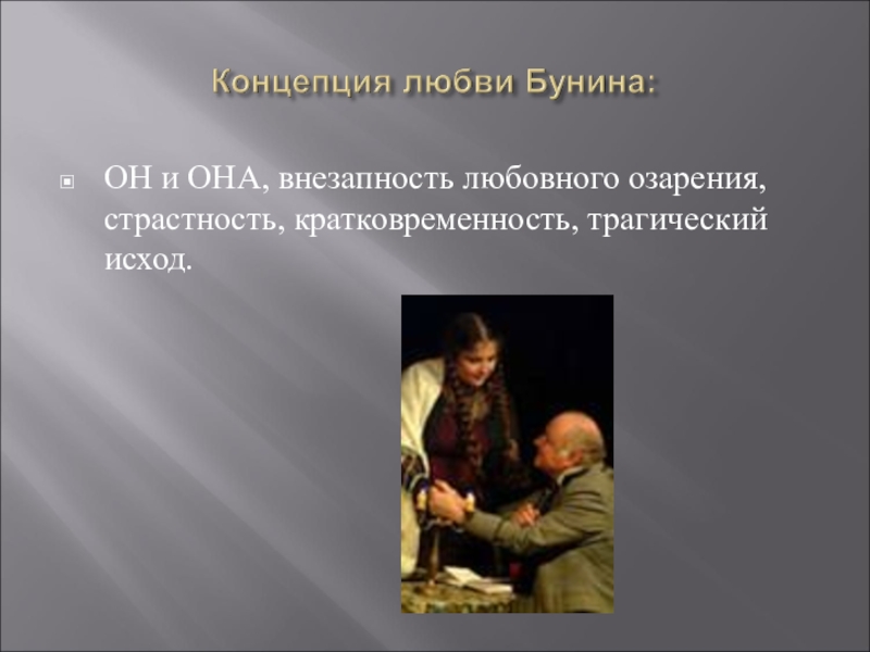 Слайд 17ОН и ОНА, внезапность любовного озарения, страстность, кратковременность, трагический исход.