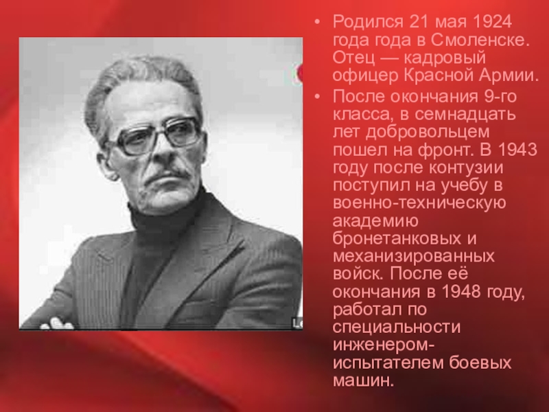 Слайд 2Родился 21 мая 1924 года года в Смоленске. Отец — кадровый