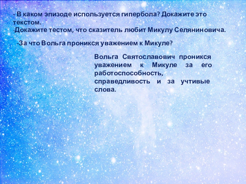 Вольга Святославович проникся уважением к Микуле за его работоспособность, справедливость и за учтивые слова.