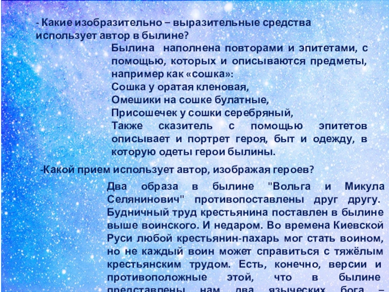 Два образа в былине "Вольга и Микула Селянинович" противопоставлены друг другу. Будничный труд крестьянина поставлен в былине выше воинского. И недаром. Во времена Киевской Руси любой крестьянин-пахарь мог стать воином, но не каждый воин может справиться с тяжёлым крестьянским трудом. Есть, конечно, версии и противоположные этой, что в былине представлены нам два языческих бога – земледелия и охоты.