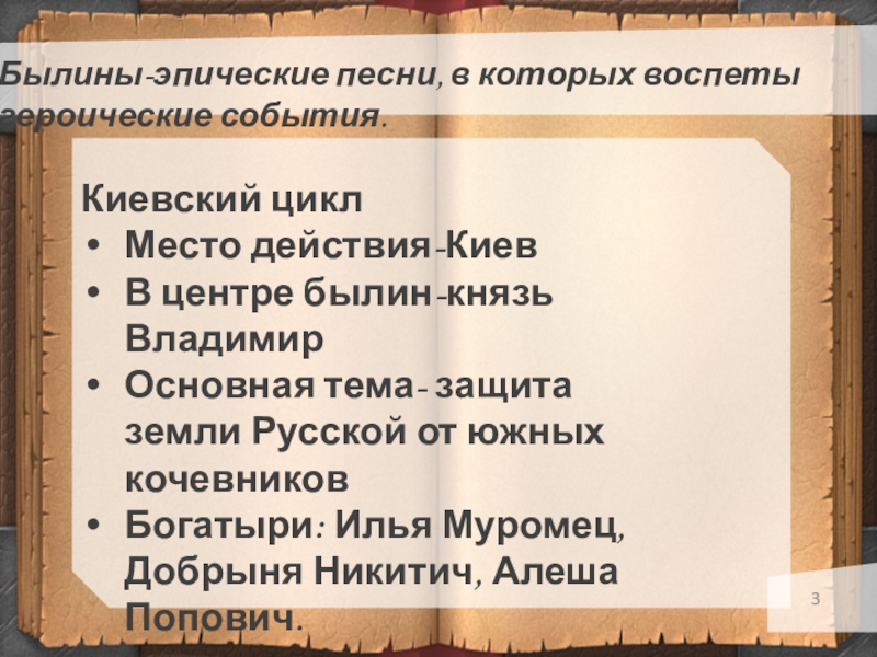 Былины-эпические песни, в которых воспеты героические события.Киевский циклМесто действия-КиевВ центре былин-князь ВладимирОсновная тема- защита земли Русской от