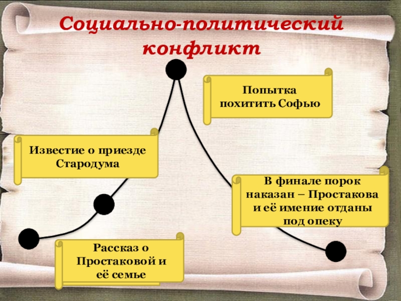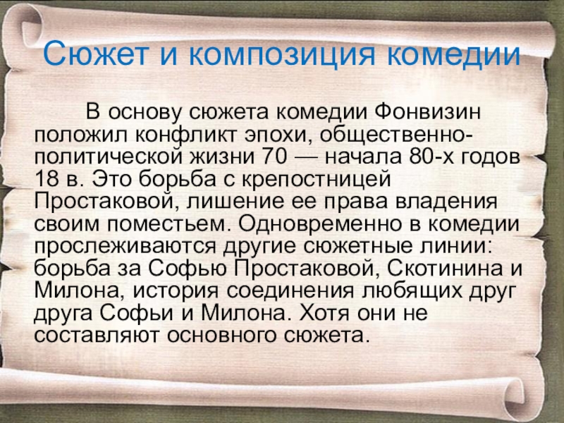 Фонвизин положил конфликт эпохи, общественно-политической жизни 70 — начала 80-х годов 18 в. Это борьба с крепостницей Простаковой, лишение ее права владения своим поместьем. Одновременно в комедии прослеживаются другие сюжетные линии: борьба за Софью Простаковой, Скотинина и Милона, история соединения любящих друг друга Софьи и Милона. Хотя они не составляют основного сюжета.