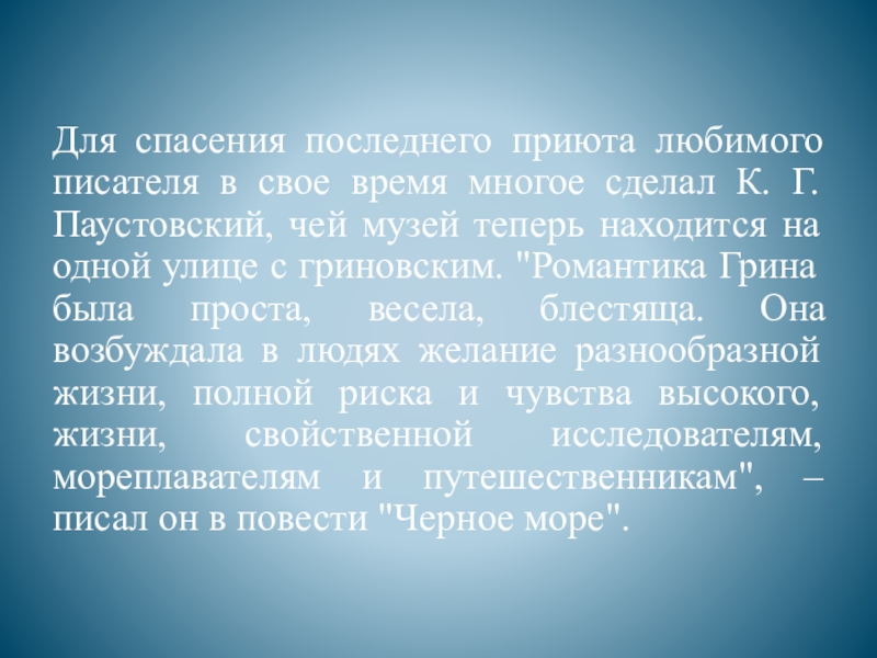 К. Г. Паустовский, чей музей теперь находится на одной улице с гриновским. "Романтика Грина была проста, весела, блестяща. Она возбуждала в людях желание разнообразной жизни, полной риска и чувства высокого, жизни, свойственной исследователям, мореплавателям и путешественникам", – писал он в повести "Черное море".