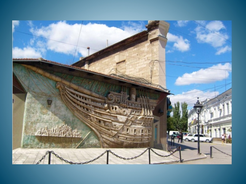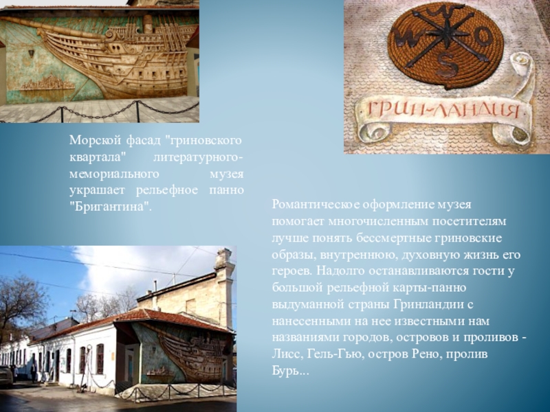 Слайд 16Морской фасад "гриновского квартала" литературного-мемориального музея украшает рельефное панно "Бригантина".