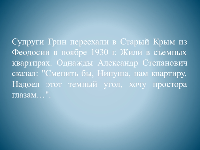 Слайд 8Супруги Грин переехали в Старый Крым из Феодосии в ноябре 1930
