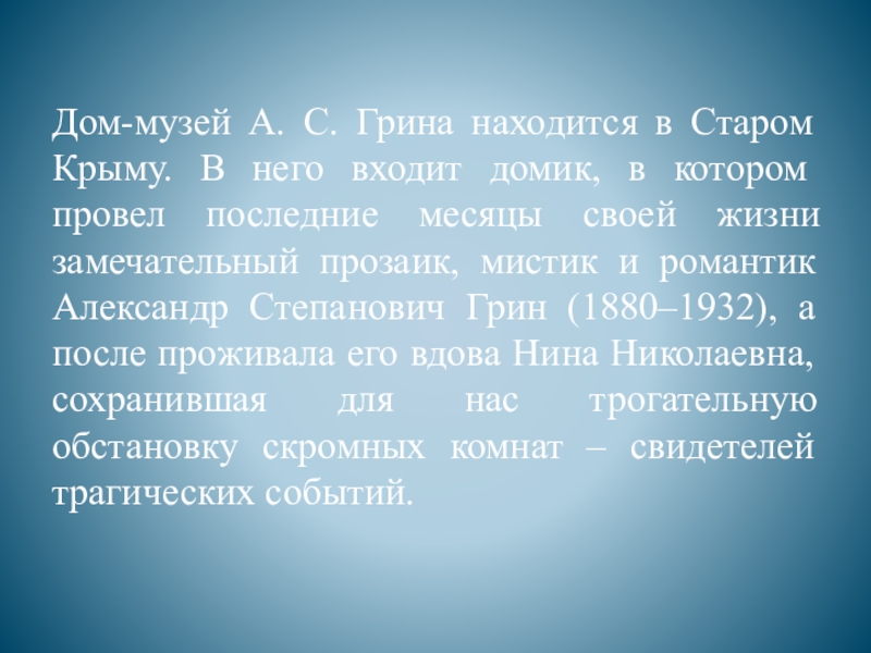 Слайд 7Дом-музей А. С. Грина находится в Старом Крыму. В него входит