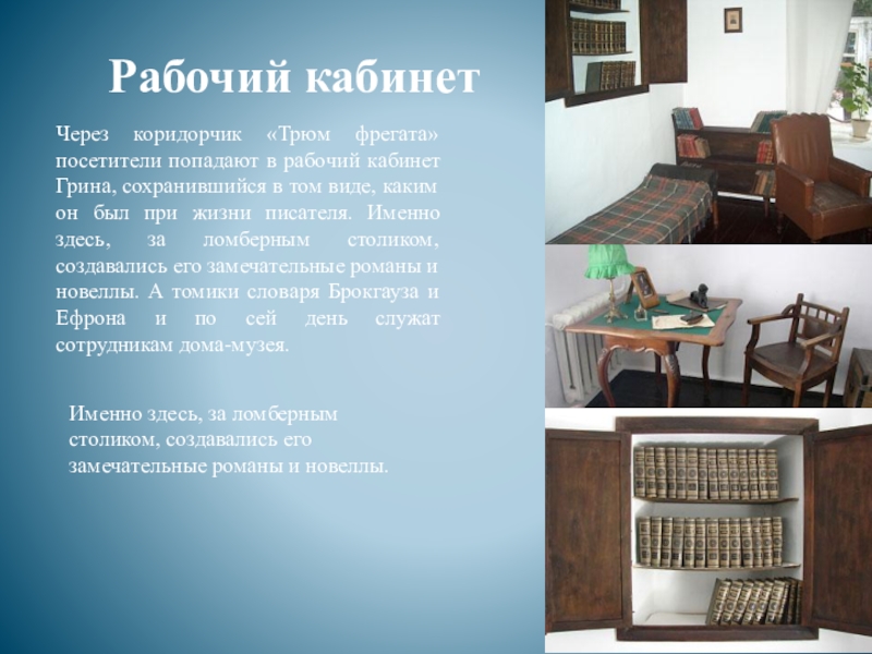 Через коридорчик «Трюм фрегата» посетители попадают в рабочий кабинет Грина,