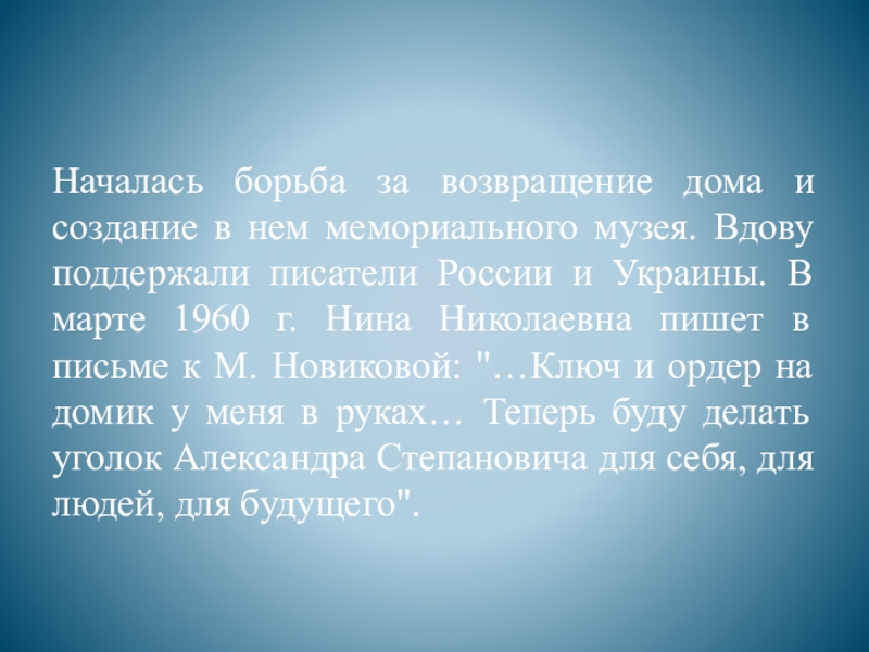 Вдову поддержали писатели России и Украины. В марте 1960 г. Нина Николаевна пишет в письме к М. Новиковой: "…Ключ и ордер на домик у меня в руках… Теперь буду делать уголок Александра Степановича для себя, для людей, для будущего".