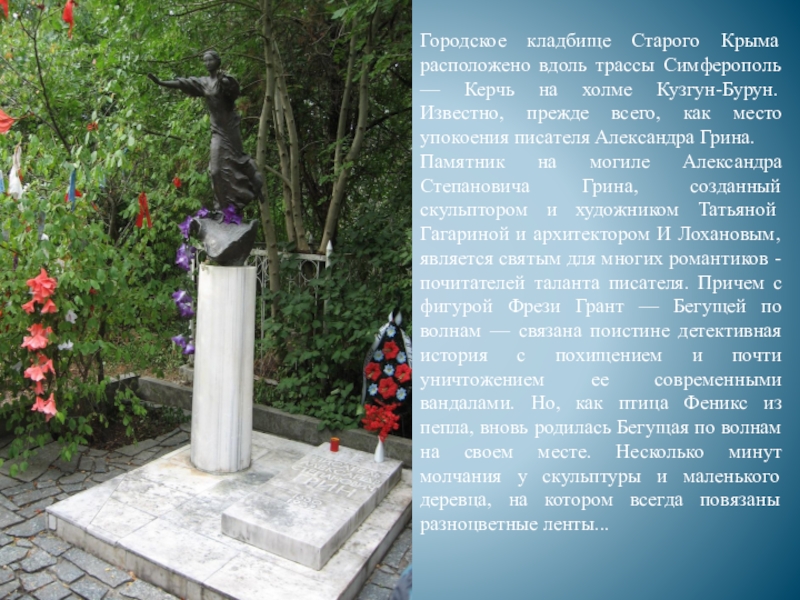Памятник на могиле Александра Степановича Грина, созданный скульптором и художником Татьяной Гагариной и архитектором И Лохановым, является святым для многих романтиков - почитателей таланта писателя. Причем с фигурой Фрези Грант — Бегущей по волнам — связана поистине детективная история с похищением и почти уничтожением ее современными вандалами. Но, как птица Феникс из пепла, вновь родилась Бегущая по волнам на своем месте. Несколько минут молчания у скульптуры и маленького деревца, на котором всегда повязаны разноцветные ленты...