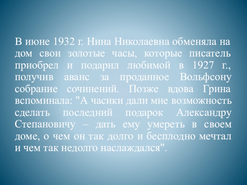 часы, которые писатель приобрел и подарил любимой в 1927 г., получив аванс за проданное Вольфсону собрание сочинений. Позже вдова Грина вспоминала: "А часики дали мне возможность сделать последний подарок Александру Степановичу – дать ему умереть в своем доме, о чем он так долго и бесплодно мечтал и чем так недолго наслаждался".