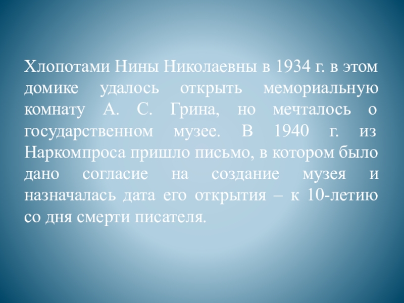 мемориальную комнату А. С. Грина, но мечталось о государственном музее. В 1940 г. из Наркомпроса пришло письмо, в котором было дано согласие на создание музея и назначалась дата его открытия – к 10-летию со дня смерти писателя.