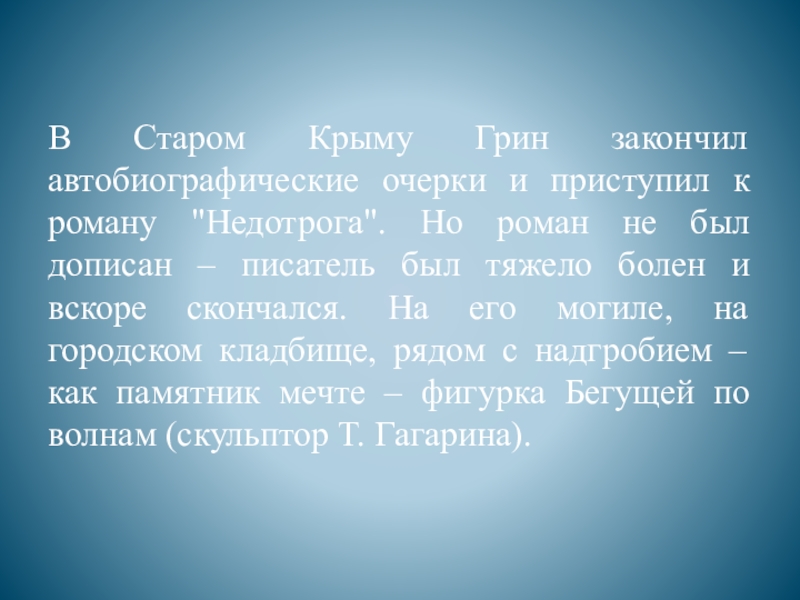 Слайд 10В Старом Крыму Грин закончил автобиографические очерки и приступил к роману