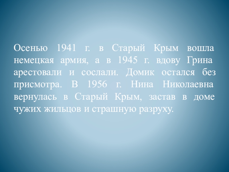 1945 г. вдову Грина арестовали и сослали. Домик остался без присмотра. В 1956 г. Нина Николаевна вернулась в Старый Крым, застав в доме чужих жильцов и страшную разруху.