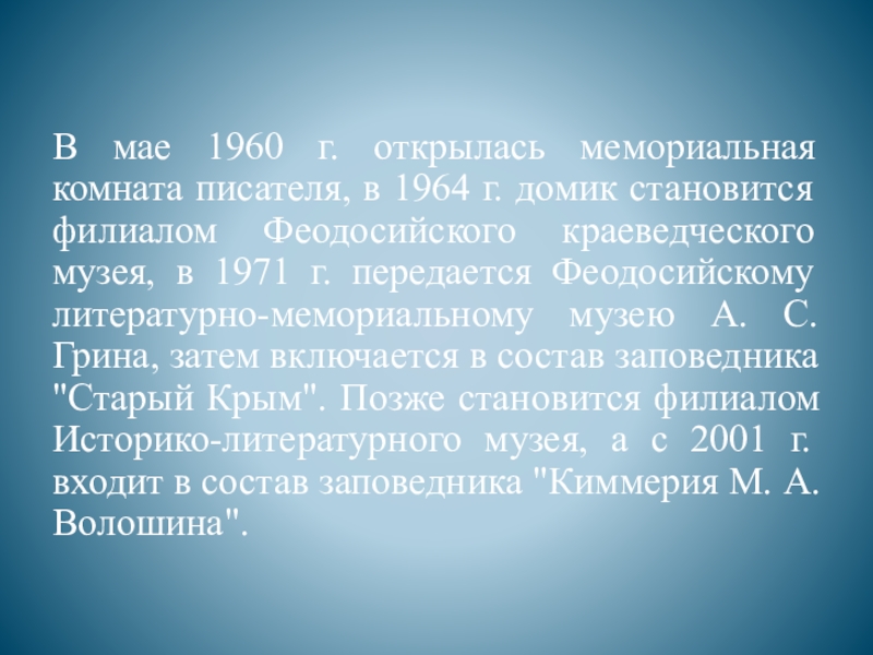 домик становится филиалом Феодосийского краеведческого музея, в 1971 г. передается Феодосийскому литературно-мемориальному музею А. С. Грина, затем включается в состав заповедника "Старый Крым". Позже становится филиалом Историко-литературного музея, а с 2001 г. входит в состав заповедника "Киммерия М. А. Волошина".
